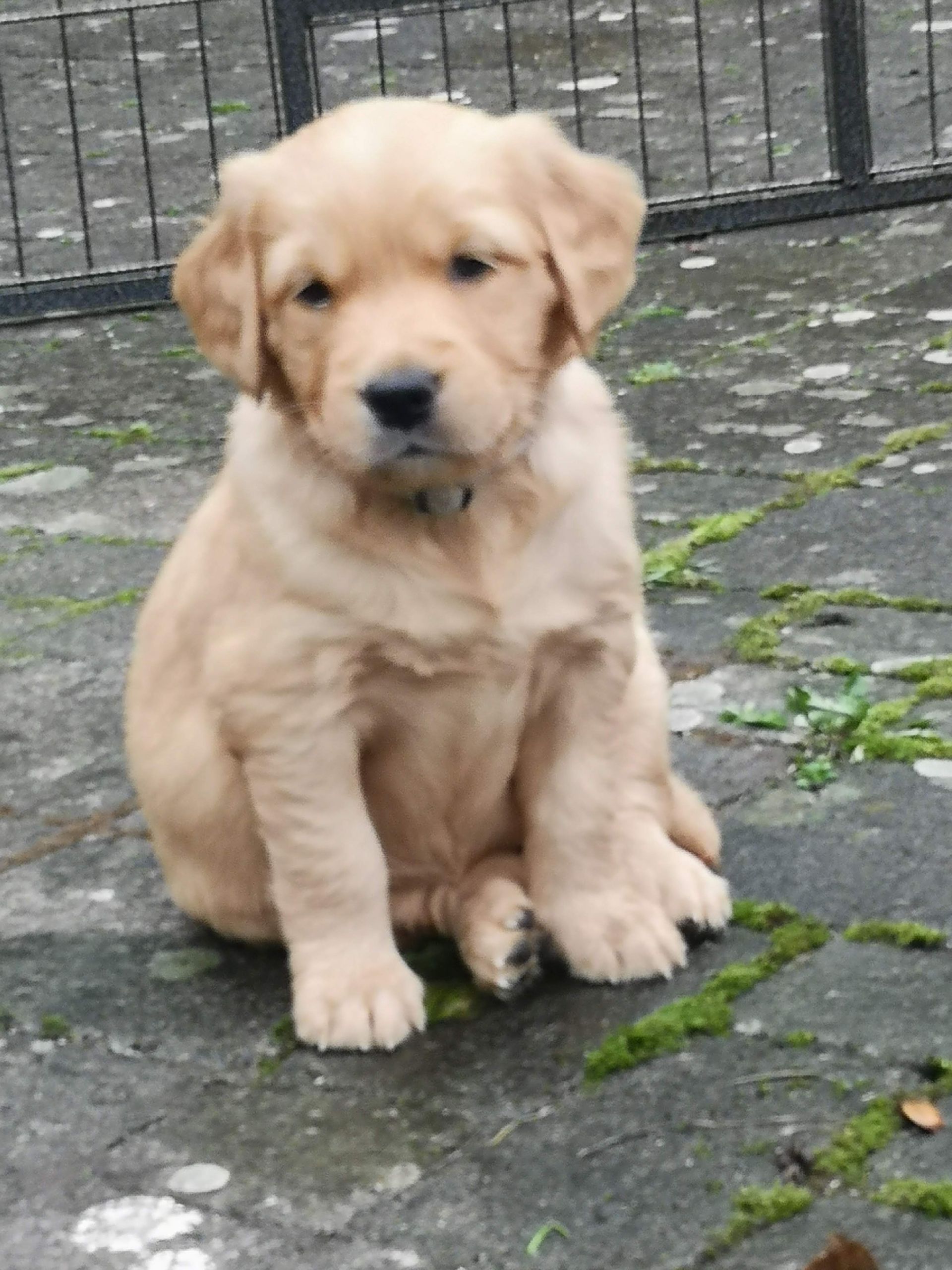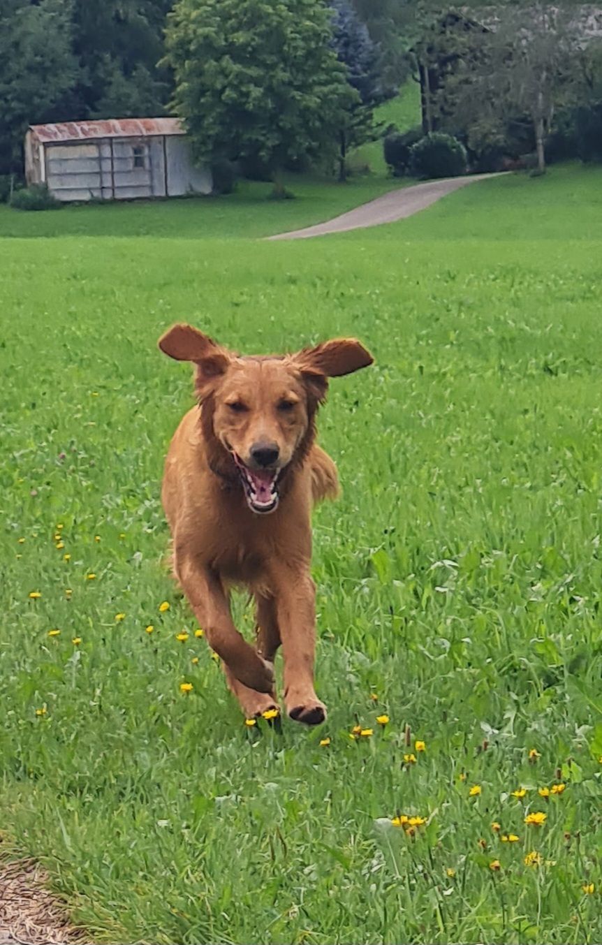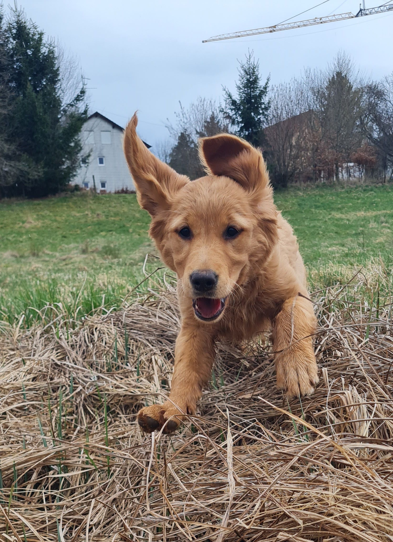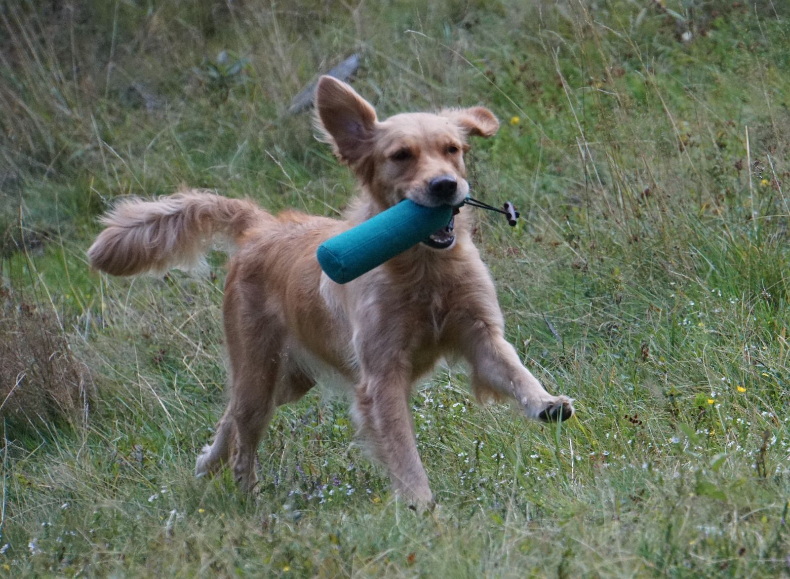 Die 2 1/4 Jahre alte Golden Hündin zeigt sich heute sicher und offen gegenüber Fremdpersonen, die Arbeit mit Beute zeigt sie freudig und ausdauernd, den Parcours durchläuft sie selbständig und unbelastet.
